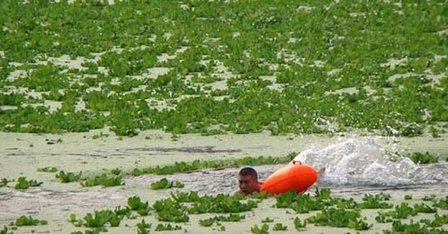 武汉汉江浮萍绿如茵 泳者戏水又踏青